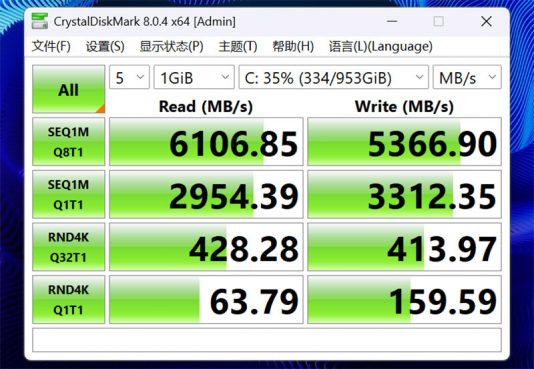 在CrystalDiskMark测试中,暗影精灵11标配的这块铠侠BG6系列SSD的连续写入速度达到了5366.90MB/s,连续读取速度为6106.85MB/s,可以确保系统启动、游戏加载与文件传输的流畅性。