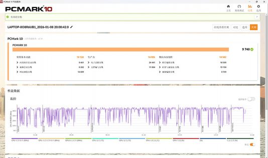 凭借均衡的配置,暗影精灵11在PCMark测试中的综合得分达到了9740,其中生产力性能分数为16985,数位内容创作分数达到14582,说明这台游戏本在办公、创作等生产力场景中也能有出色表现。