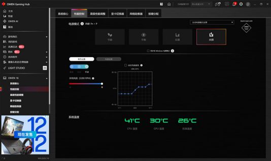 暗影精灵11预装了惠普OMEN Gaming Hub控制软件,可以对系统性能进行更灵活的设置。性能控制方面,除了提供节能、平衡、狂暴三种模式外,动手能力强的玩家还可以选择大师模式,甚至通过高级性能调整实现对CPU、GPU进行更精准的调节。丰富的性能模式切换,可以根据不同场景灵活调整性能输出与功耗表现,日常办公开启节能模式,续航表现可圈可点;游戏或创作时切换至狂暴模式,即可获得满血性能输出。当然,对于普通游戏玩家而言,我们认为狂暴模式是建议选项。