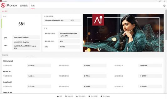 RTX 5060笔记本电脑GPU的算力达到了572 TOPS,在Procyon Windows ML测试中,其GPU float32测试总分为581分。实际使用中,也可以运行经过蒸馏的大模型,或者在Stable Diffusion中较快地进行文生图操作。