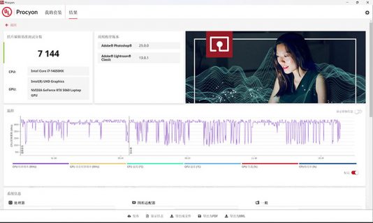 另外,我们也测试了暗影精灵11的生产力性能,比如我们最常用的照片编辑方面,基于Procyon照片编辑基准测试模拟运行PS和LC,其性能得分达到了7144。