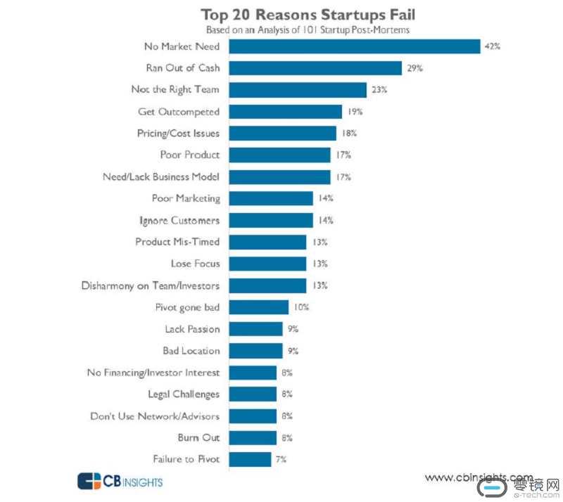 早在2014年,美国科技市场研究公司CB Insights通过分析101个科技创业公司的失败案例,总结出了创业公司失败的20大主要原因:不符合市场需求、融资烧完、团队不行、竞争力不足、定价/成本出现问题、产品糟糕、缺乏商业模式、糟糕的营销、忽视客户、产品推出时间点不对、精力不集中、创始人和投资者意见不合、发展方向偏离轨道、缺乏热情、地理位置不佳、无融资和投资者支持、法律风险、未有效利用网络和倾听意见、工作与生活协调失败、未能及时纠正错误。