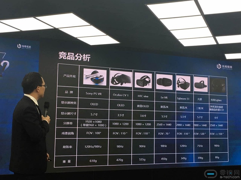 由此,上述的参数配置无从验证。尤其对于光场眼镜Gglass只有80g这个说法。稍微有常识的朋友都知道这个数据有点问题。对此,赵清泉在会后的采访中向零镜网表示:“眼镜只是头显部分是可以做的80克的,采用特殊的订制屏甚至50g都有可能,不过一体机就做不到了。”