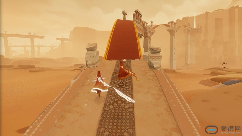 场景之于视线:比如说《风之旅人》最后的圣山场景。如果是VR玩家一起携手走进山里,山里有一座闪闪发光的宫殿;那么在这个场景里玩家就只有两种选择,向前看或向后看,因为两边都是大山,天上也只有蓝蓝的一片,没有趣味点,并且移动时看近景并不符合人类的观察习惯。加之在VR里倒着走路是很慌的,所以99%的玩家都会一眼看到前方的宫殿正门(侧门被大山挡住了)。如果这时正门有剧情画面,那么玩家就会在相当长的时间里把注意力都放在宫殿正门上。同理,打开箱子和衣柜的一瞬间玩家的视角也是固定的。