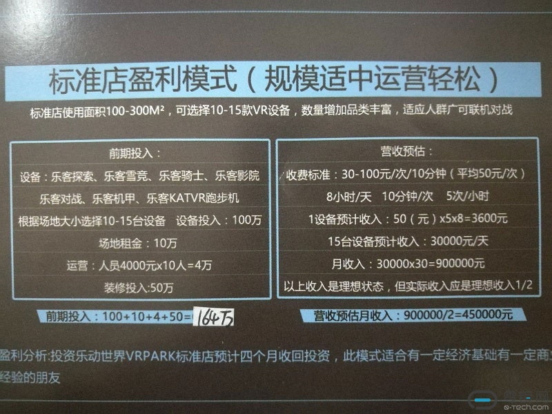 而大空间定制方案的成本却又是巨大的:除了设备采购(像店内的头显、摄像头、VR背包等),以及后续的维护费用,还有方案商定制内容的花费以及更昂贵的场租。高能视界选择的是商场,这意味着每平米租金价格的更高。另外,高能视界对外宣称大致为1800平米的空间范围,每个厅大致在150平米-200平米之间,但实际体验感知估计在80平米-100平米之间,目前有5个厅。算下来的场租成本是一笔大的消耗,再加上估计为10人的人力成本,花费可想而知。